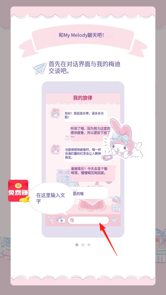 1、進(jìn)入聊天引導(dǎo)界面,看到美樂蒂對(duì)話示例,點(diǎn)擊輸入框,輸入文字,借助對(duì)話互動(dòng)機(jī)制,與角色交流,通過操作,開啟情感陪伴體驗(yàn),感受虛擬聊天的趣味。