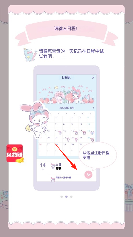 2、進(jìn)入日程記錄界面,看到可愛日歷布局,點(diǎn)擊日程注冊(cè)按鈕,添加行程,利用日程管理機(jī)制,規(guī)劃每日安排,記錄生活點(diǎn)滴,體驗(yàn)時(shí)間規(guī)劃的玩法,感受生活記錄的溫馨。