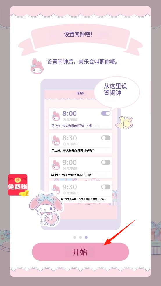2、日程鬧鐘設(shè)置:點(diǎn)擊兔子圖標(biāo)選擇筆記本標(biāo)識(shí)進(jìn)入日歷界面,點(diǎn)擊右下角圖標(biāo)添加日程,選擇兔子標(biāo)識(shí)進(jìn)入鬧鐘界面,可設(shè)定鬧鐘讓美樂蒂叫醒,輕松管理時(shí)間。