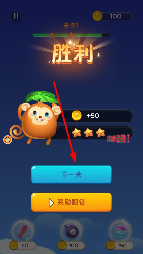 3、完成當(dāng)前關(guān)卡消除任務(wù),顯示“勝利”界面,獲得金幣獎(jiǎng)勵(lì),點(diǎn)擊“下一關(guān)”按鈕,挑戰(zhàn)更復(fù)雜的圖案矩陣。