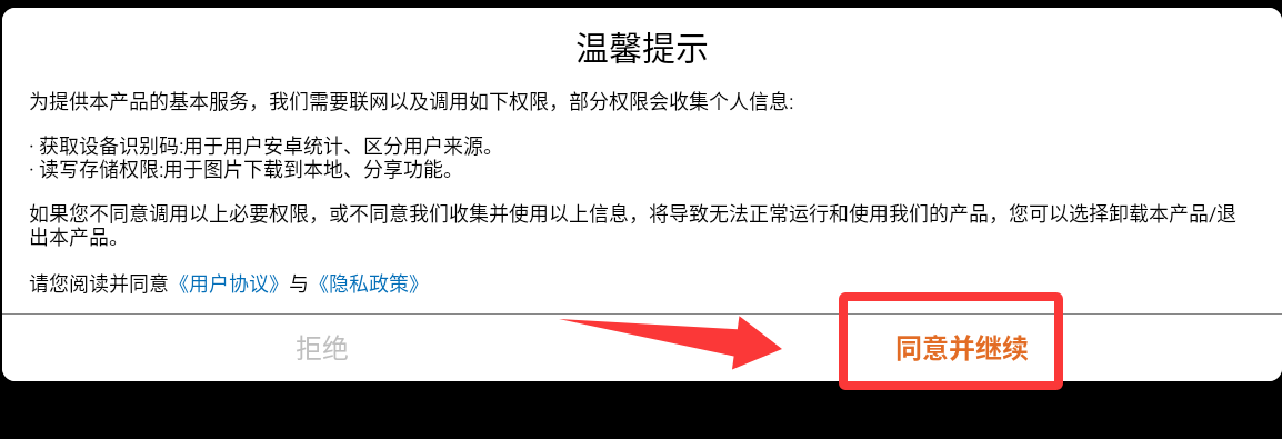 1、點擊紅色框框的溫馨提示里的同意并繼續(xù)。