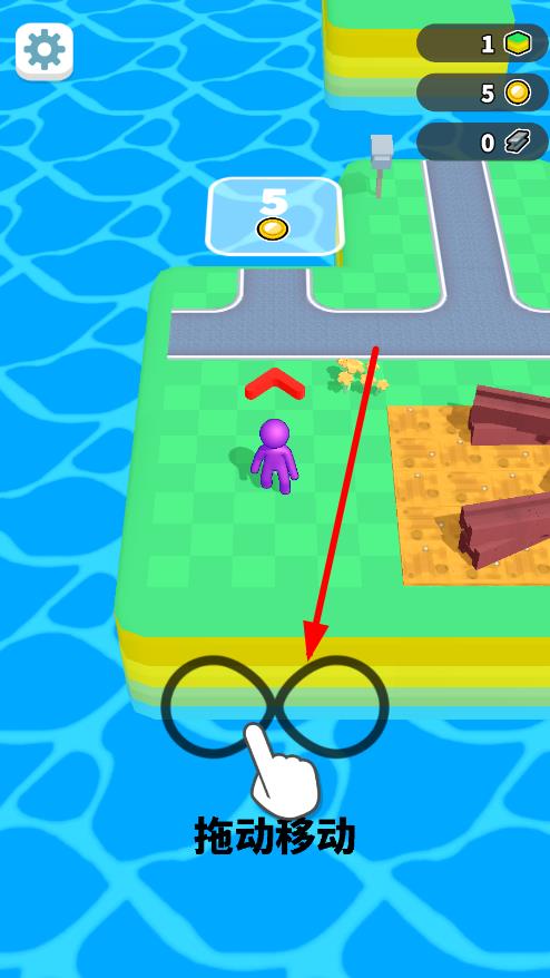 1、進(jìn)入游戲,依據(jù)“拖動移動”提示,滑動屏幕控制紫色角色在島嶼移動,前往資源點(diǎn),準(zhǔn)備采集建造材料。