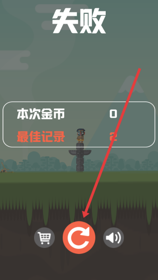 3、若挑戰(zhàn)失敗,在失敗界面處,通過點擊紅色重玩按鈕,重新進入關(guān)卡再次嘗試射中目標。