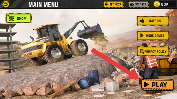 1、點擊PLAY方可進入場景游玩,畫面中有黃色挖掘機、穿著工裝的人物,呈現(xiàn)施工場景,還有0XP顯示。