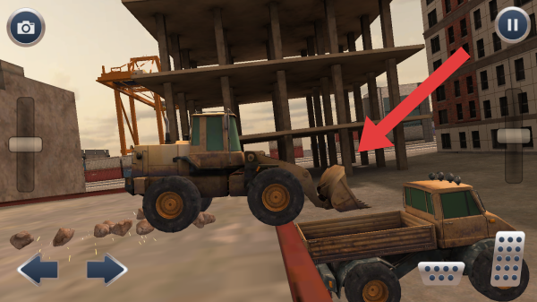 3、呈現(xiàn)建筑施工場景有未完工建筑、起重機等,界面有控制按鈕方向、操作鍵、相機和暫停圖標,展現(xiàn)車輛協(xié)同作業(yè)的內(nèi)容。