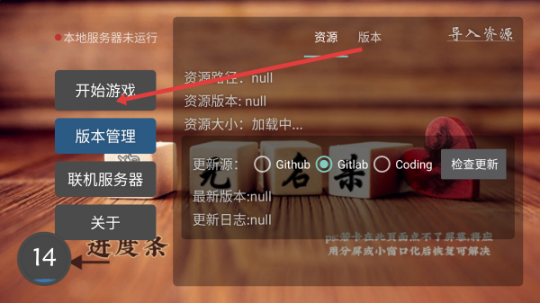 1、進(jìn)入游戲界面后,可看到開(kāi)始游戲版本管理聯(lián)機(jī)服務(wù)器關(guān)于等功能選項(xiàng),若想開(kāi)啟游戲冒險(xiǎn)。