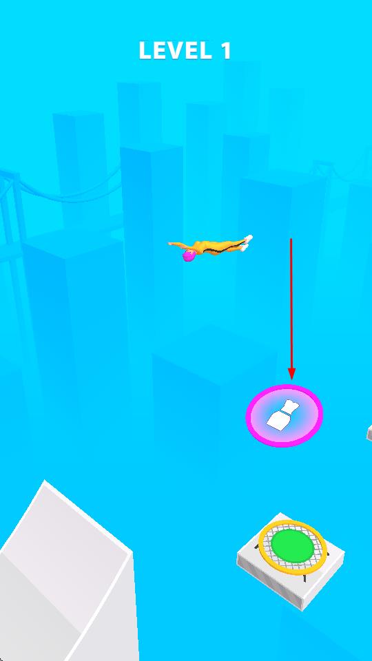 1、進(jìn)入游戲后,操控角色在藍(lán)色背景的城市環(huán)境中進(jìn)行運(yùn)動(dòng),首先從高處跳下,落在綠色的蹦床上,借助蹦床的彈力繼續(xù)前進(jìn)。