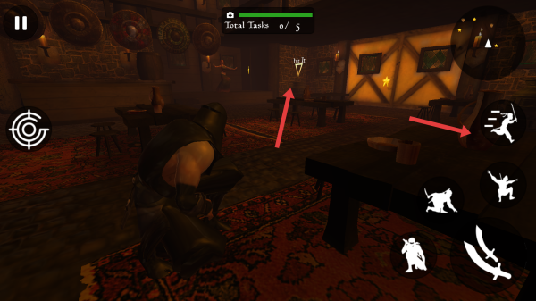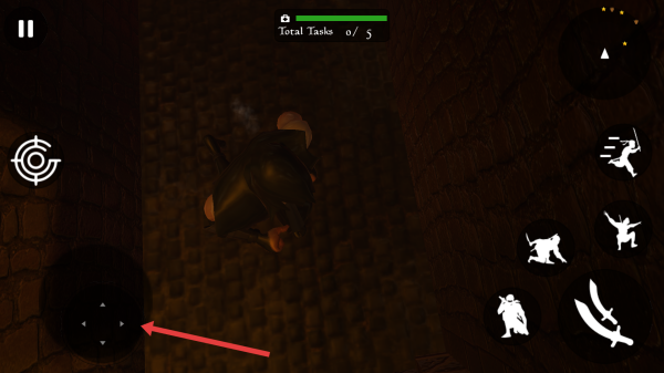 2、關(guān)卡中,用左側(cè)搖桿方向鍵控制忍者移動,在昏暗巷道小心潛行,避開敵人。