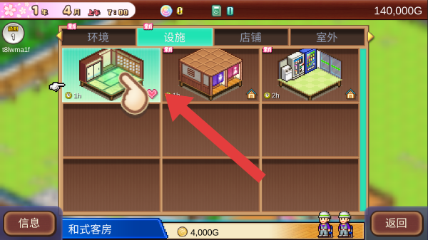 1、畫(huà)面顯示設(shè)施建造界面,玩家可選擇建造如和式客房等設(shè)施,下方顯示和式客房售價(jià)為4000G。