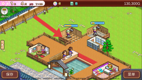 2、展示了溫泉度假酒店的建造經(jīng)營(yíng)場(chǎng)景,紅色箭頭所指位置是提示關(guān)注工人或建筑相關(guān)操作,畫(huà)面中有客人、工人、溫泉設(shè)施等元素。