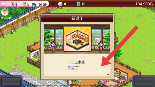 3、顯示新設(shè)施提示,告知玩家可以建造食堂了,呈現(xiàn)的是游戲中解鎖新建筑設(shè)施的界面。