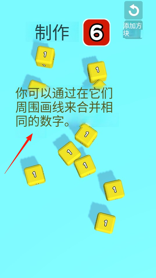 1、在包圍數(shù)字制作界面,觀察黃色數(shù)字方塊分布,用畫線方式,連接相同數(shù)字1的方塊,使其合并,通過畫線操作,減少方塊數(shù)量,向目標數(shù)字推進,體驗合并數(shù)字的機制。