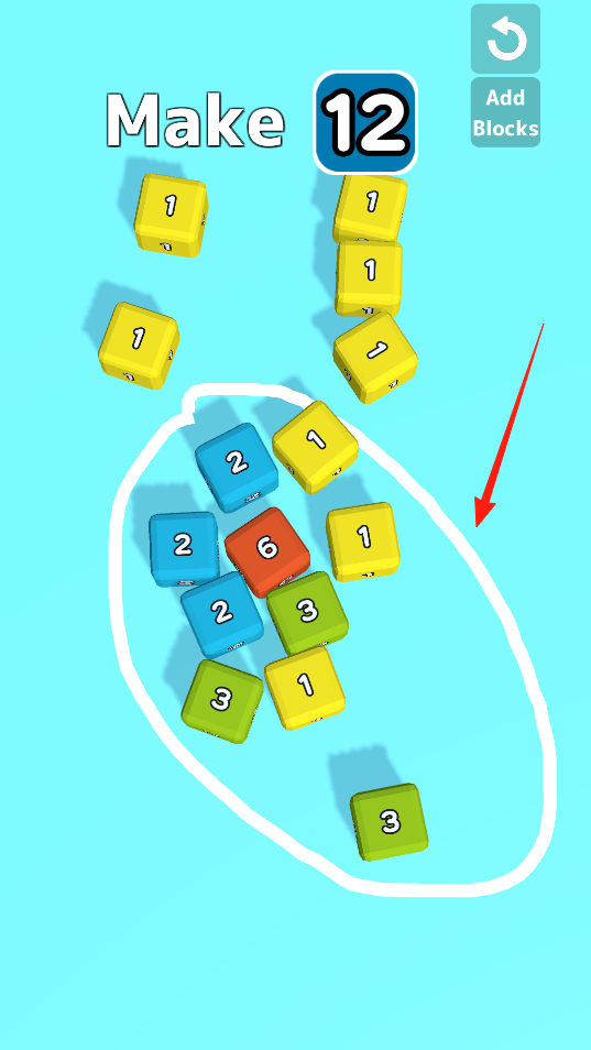 3、進入新關(guān)卡,目標數(shù)字為12,場景有多種數(shù)字方塊,規(guī)劃畫線范圍,圈選不同數(shù)字方塊,使其合并計算,通過組合圈選,讓方塊數(shù)字總和達12,體驗組合合并的機制。