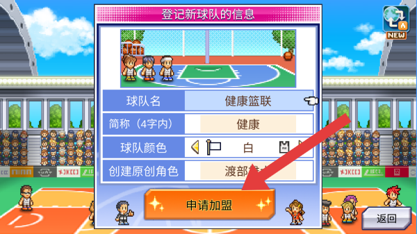 2、球隊名健康籃聯(lián),球隊顏色白,創(chuàng)建原創(chuàng)角色渡部,點擊操作按鈕申請加盟,屬于創(chuàng)建新球隊流程的環(huán)節(jié)。