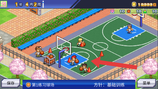 3、第1練習球場,方針為基礎(chǔ)訓練,畫面中有籃球架、球員、籃球、訓練錐桶等元素,還有保存、菜單按鈕。