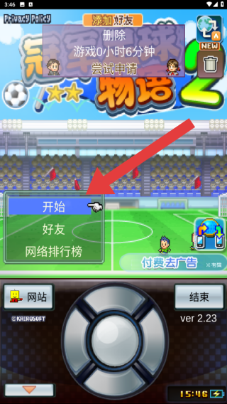 1、功能選項:開始、好友、網(wǎng)絡排行榜,點擊開始方可進入游戲,足球賽場背景,帶有相關的足球元素。
