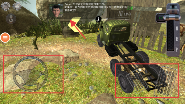 3、在游戲場景中,左側(cè)有方向盤控制按鈕,右側(cè)有腳踏控制區(qū)域,利用這些控制按鈕操控車輛移動,同時注意游戲內(nèi)的對話提示,推進(jìn)游戲劇情。