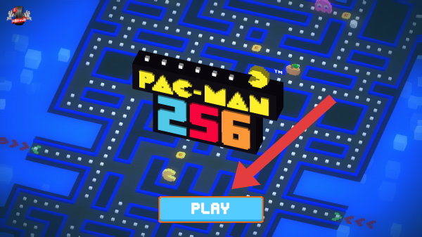 1、背景是經(jīng)典的吃豆人迷宮的場(chǎng)景,點(diǎn)擊箭頭所指的PLAY的按鈕即可進(jìn)入場(chǎng)景并開(kāi)始游戲。