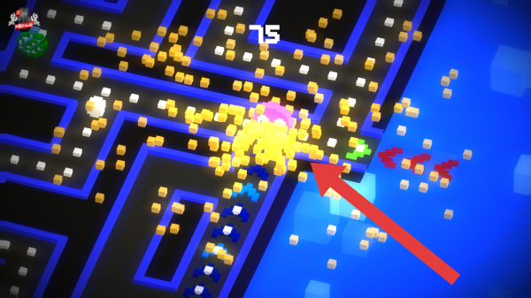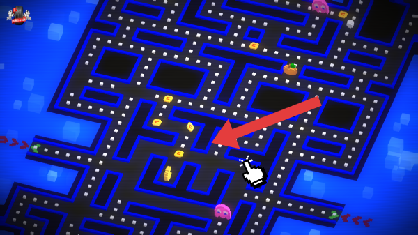 2、展示了經(jīng)典的迷宮場(chǎng)景,有豆子、金幣以及幽靈等元素,根據(jù)箭頭指向的提示,是引導(dǎo)玩家操控吃豆人移動(dòng)來(lái)收集豆子。