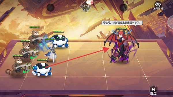2、在游戲戰(zhàn)斗場景中,操控我方角色與紅色箭頭所指的敵方角色進(jìn)行戰(zhàn)斗,根據(jù)角色技能和屬性,合理安排戰(zhàn)斗策略。