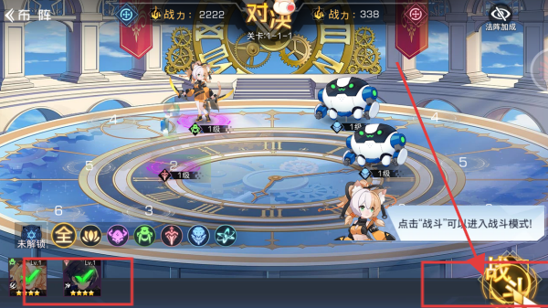 3、在對決界面,選擇紅色方框內(nèi)的角色,然后點擊右下角的戰(zhàn)斗按鈕,進(jìn)入戰(zhàn)斗模式,與敵方角色展開對決。