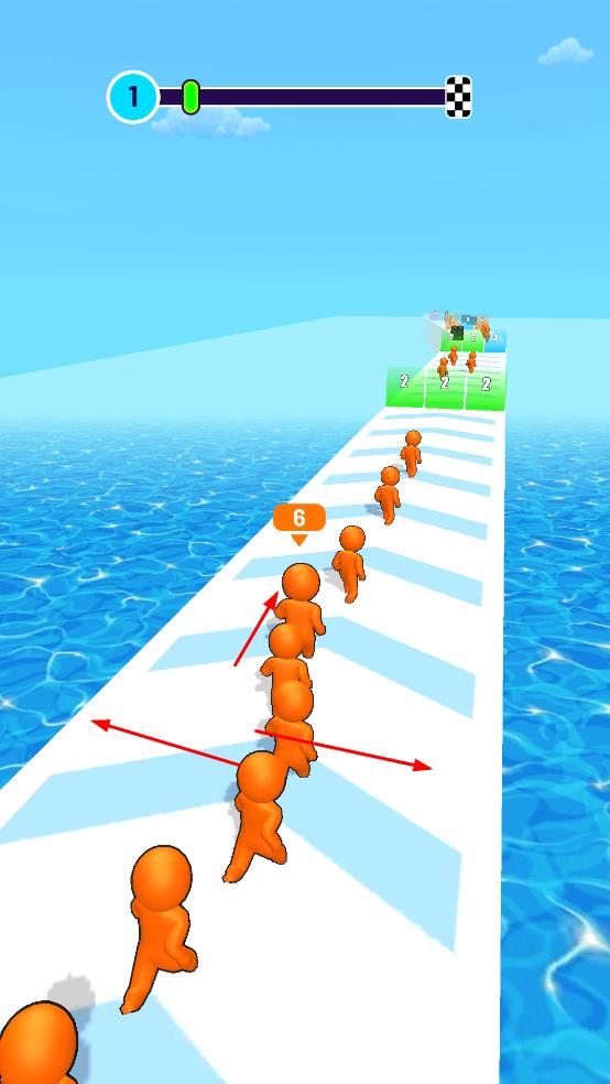 1、操控橙色小人隊(duì)伍在水上賽道上移動,通過左右移動使隊(duì)伍聚集或分散,這是開啟游戲的關(guān)鍵操作,順利開啟游戲之旅。