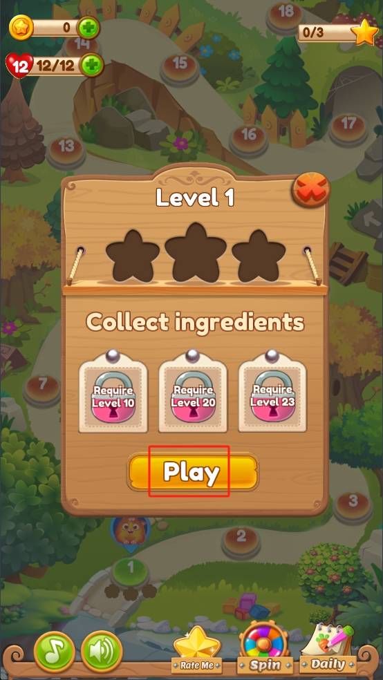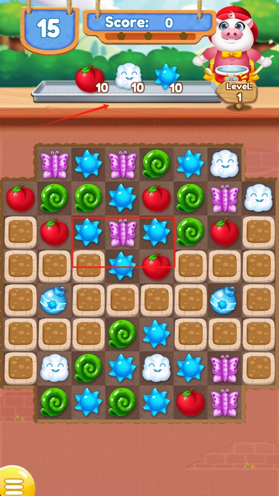 1、點(diǎn)擊關(guān)卡界面黃色Play按鈕,進(jìn)入Level1,需收集蘋果、云朵、藍(lán)星三種食材,通過消除對(duì)應(yīng)元素達(dá)成目標(biāo)。