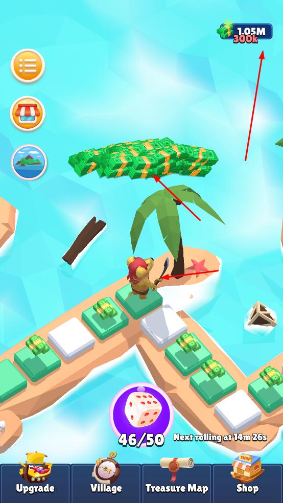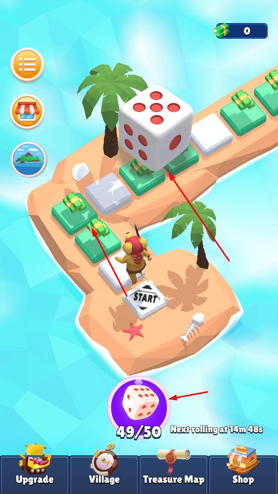 1、操控海盜角色在島嶼場景中移動,通過點擊下方的骰子按鈕讓角色前進,這是開啟游戲的關鍵操作,順利開啟游戲之旅。