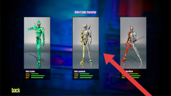 2、呈現(xiàn)角色選擇界面,包含了三個假面騎士角色,分別是假面騎士旋風(fēng)、假面騎士槍騎兵、假面騎士魔法,根據(jù)喜好進(jìn)行選擇。