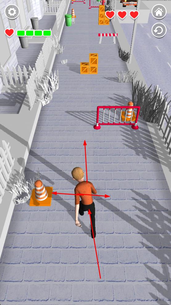 2、會遇到紅色路障、橙色路錐、黃色箱子等障礙物,角色需要避開這些障礙物,同時注意上方的生命值。