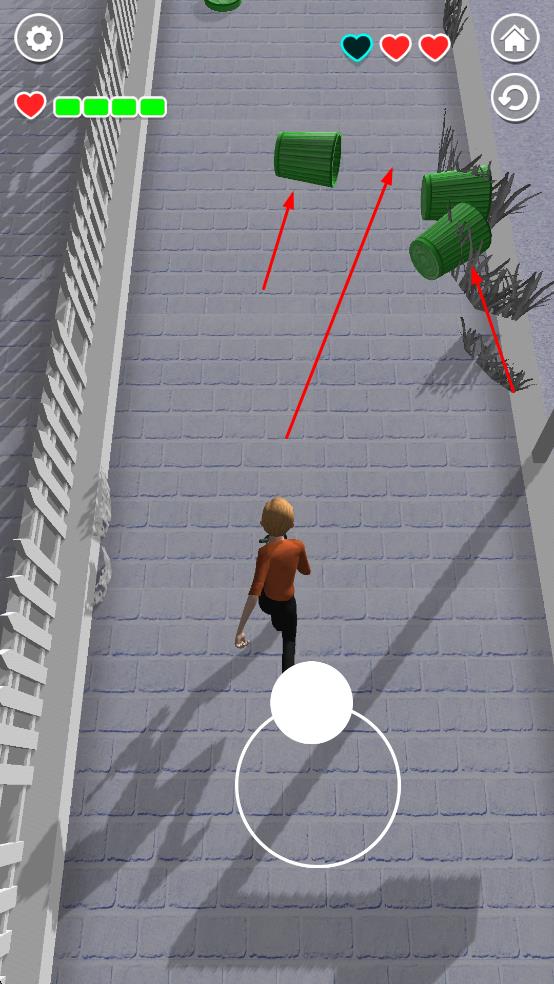 3、角色還會遇到綠色垃圾桶等可互動物體,通過合理操控角色移動,避開障礙物,完成關(guān)卡任務(wù)。