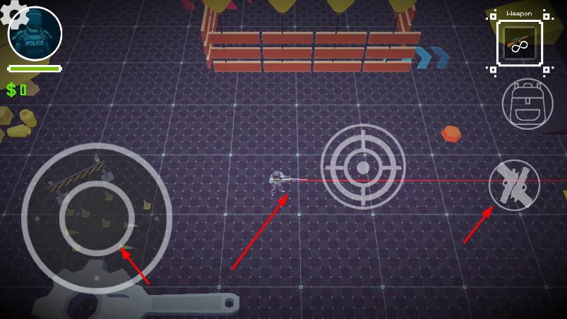 1、進入游戲,通過屏幕左側的虛擬搖桿控制角色移動,在地圖場景中探索,點擊右側的攻擊按鈕,可使用武器進行攻擊。
