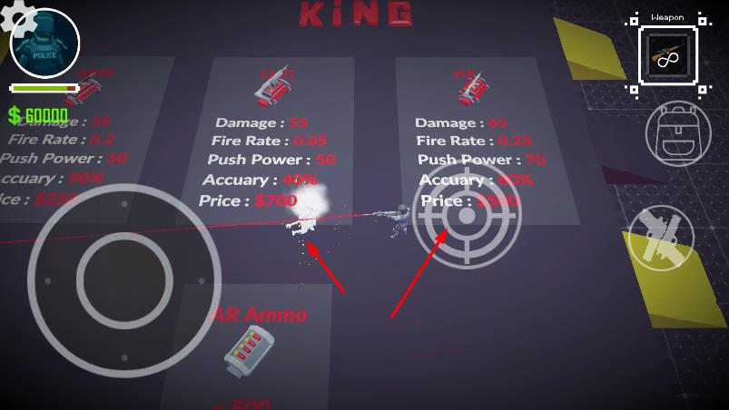 2、探索過程中,收集金幣,遇到喪尸時,瞄準喪尸并點擊攻擊按鈕進行射擊,消滅喪尸獲取資源。