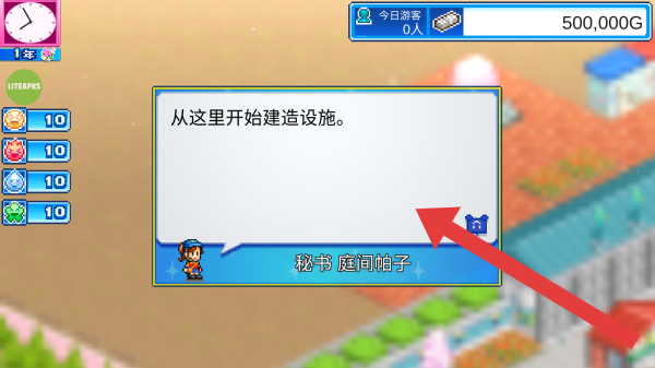 1、功能提示從這里開始建造設(shè)施,界面顯示資金500,000G,還有LITEPASS及各類資源各10單位,是初始建造引導(dǎo)環(huán)節(jié)。