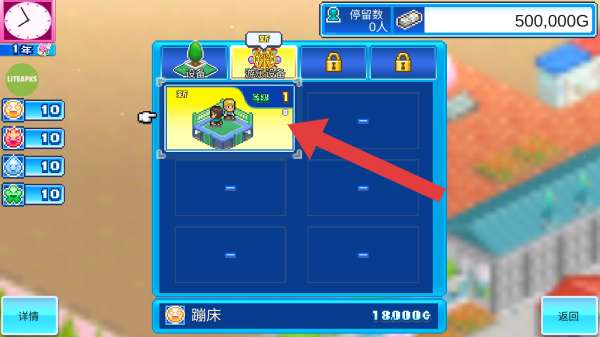2、界面顯示停留人數(shù),可建造設(shè)施蹦床費(fèi)用18000G,屬于開羅經(jīng)典的像素風(fēng)格模擬經(jīng)營設(shè)施建造選擇環(huán)節(jié),用于打造經(jīng)營場景。