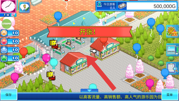 3、表明設(shè)施或區(qū)域開業(yè),屬于經(jīng)典的開羅像素風(fēng)格模擬經(jīng)營游樂園玩法,目標(biāo)是打造高客流量、高銷售額、高人氣的游樂園。