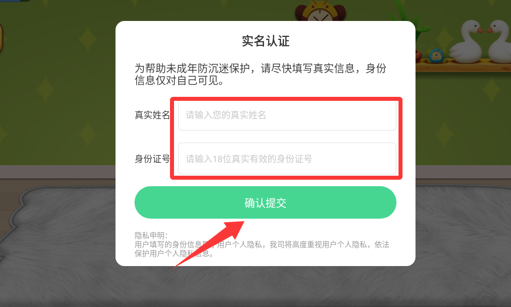 2、填寫真實的姓名和真實身份證號碼點擊確認(rèn)提交。