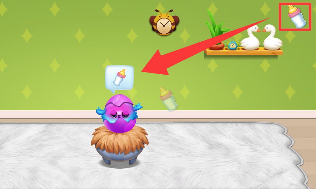4、拖動紅色框框的奶瓶喂它喝奶。