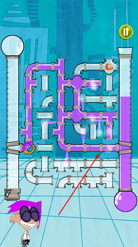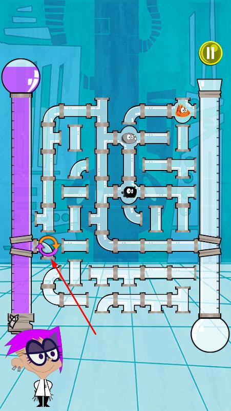 2、目標(biāo)是通過旋轉(zhuǎn)管道,構(gòu)建出一條連通的管道線路,使得左側(cè)紫色管道中的液體能夠順利流入管道網(wǎng)絡(luò),并將管道內(nèi)的生物沖出來,讓液體最終流入右側(cè)的容器中。