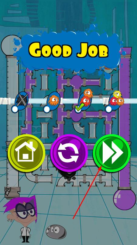 3、成功完成管道連接,使液體順利流動并沖出生物后,即可過關(guān),點擊綠色箭頭按鈕,進(jìn)入下一關(guān)。