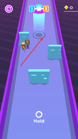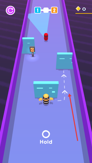 1、長按底部Hold按鈕,規(guī)劃角色移動虛線路徑,避開紅色敵人、藍色障礙物,朝著目標方向引導(dǎo)行進。