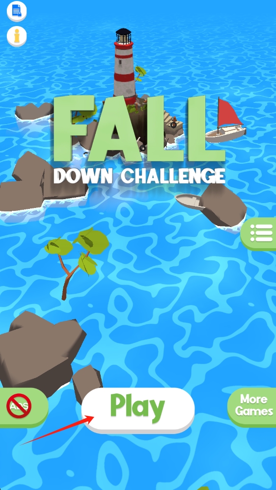 1、在Fall-Down-Challenge游戲啟動界面,跟隨箭頭提示,點擊Play,開啟墜落挑戰(zhàn)冒險,進入游戲世界。