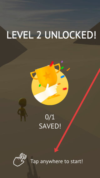 3、Level-2解鎖后,界面顯示0/1SAVED,根據(jù)箭頭提示點擊屏幕任意位置,開始第二關的挑戰(zhàn)任務。