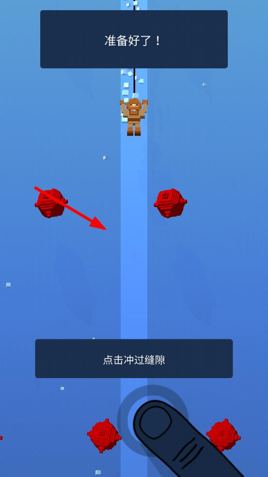 1、控制被繩子吊著的小人開(kāi)始沉降,通過(guò)點(diǎn)擊屏幕進(jìn)行沖刺,熟悉操作節(jié)奏,避開(kāi)初始遇到的障礙物。