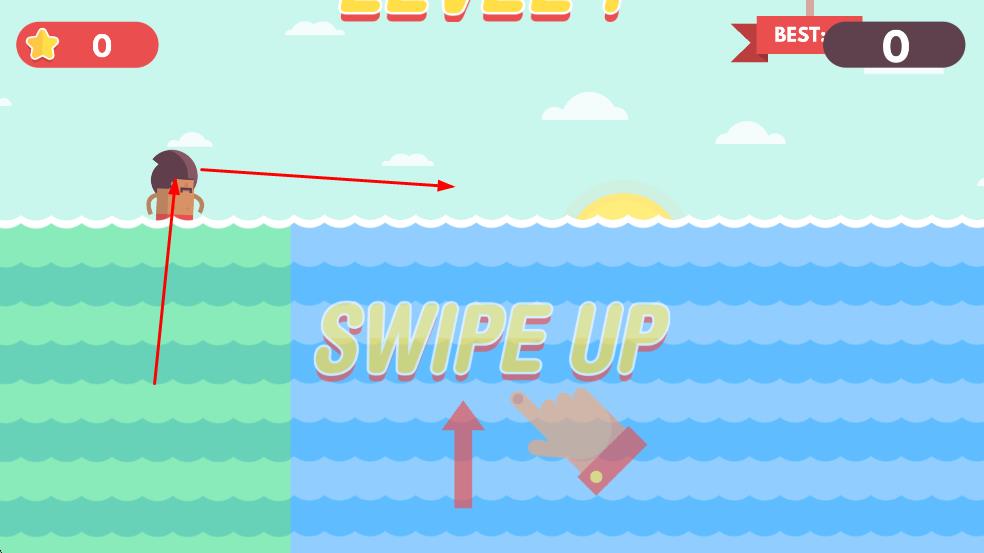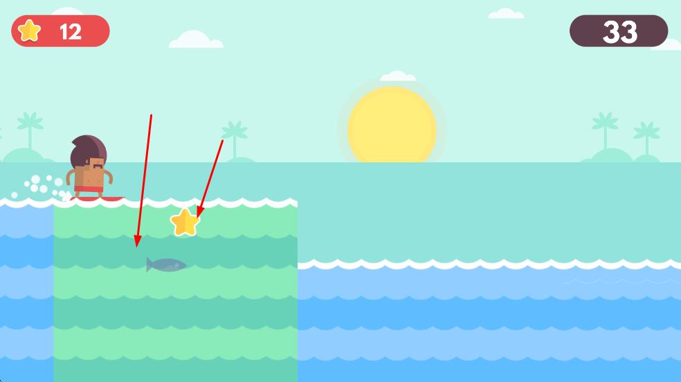 3、會遇到不同的海面布局和道具,繼續(xù)操控角色滑動屏幕,收集星星,向關卡終點前進。
