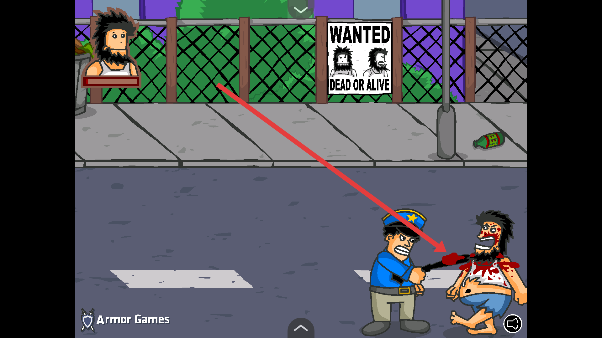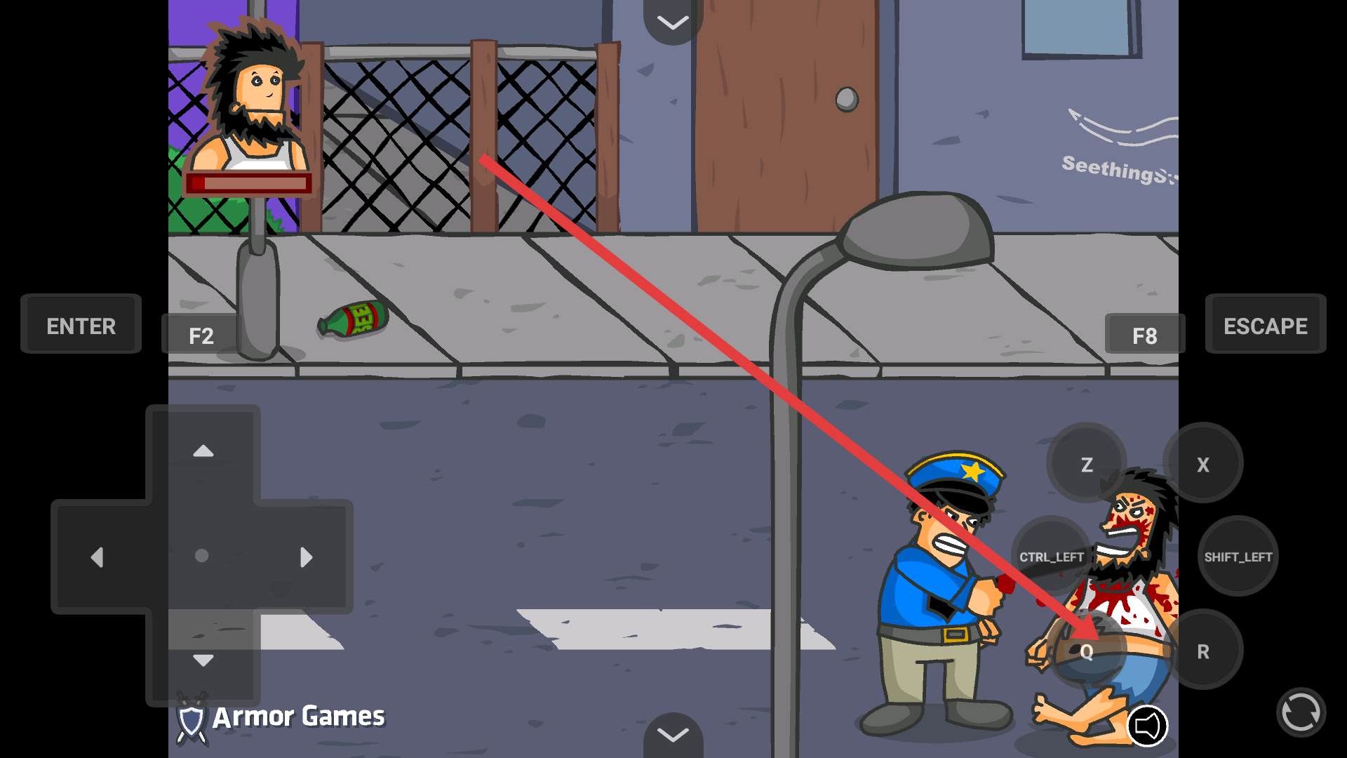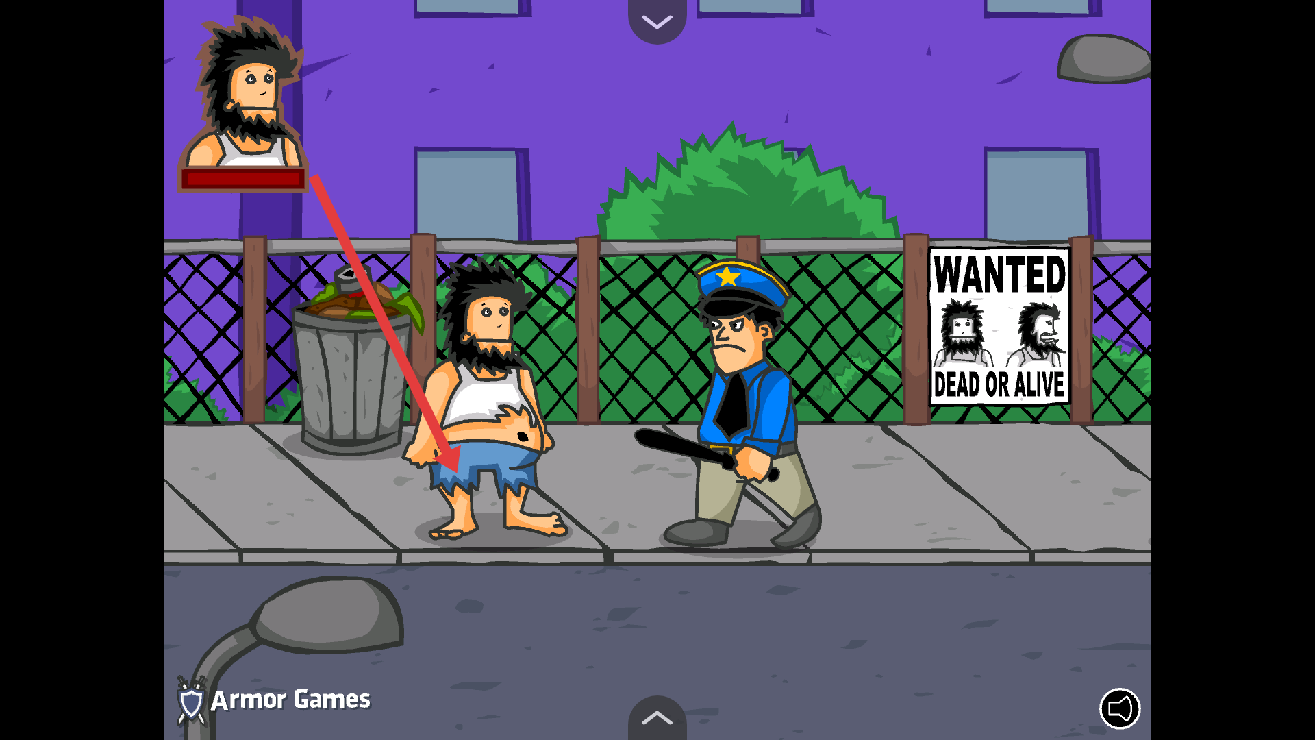 1、開(kāi)始攻擊的畫(huà)面,用方向鍵移動(dòng)著流浪漢,遇到警察攻擊時(shí),按攻擊按鈕反擊,在受到攻擊時(shí)可先躲避。