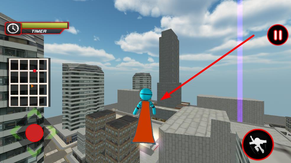 3、操控火柴人英雄飛向目標(biāo)建筑,可利用屏幕左側(cè)虛擬搖桿調(diào)整移動(dòng)方向,右側(cè)按鈕控制飛行、特技等動(dòng)作,在規(guī)定時(shí)間內(nèi)抵達(dá)目標(biāo)點(diǎn)推進(jìn)關(guān)卡。