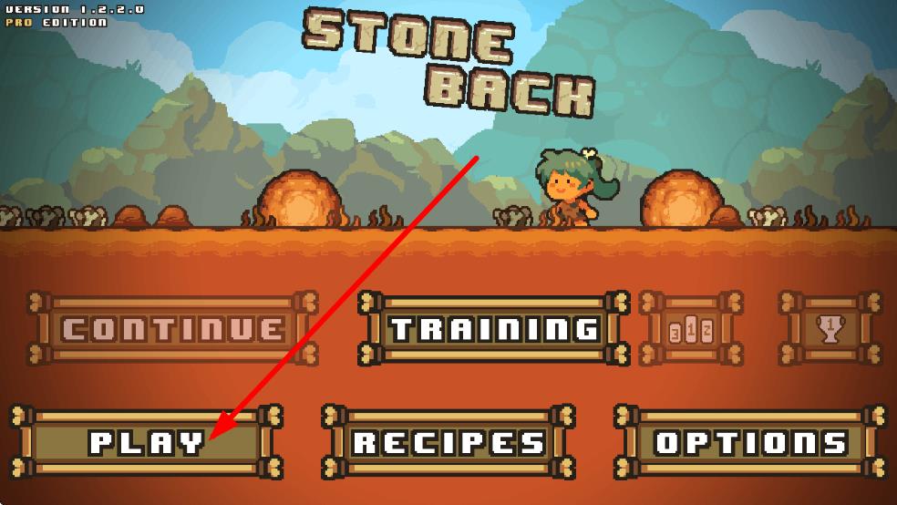 1、進(jìn)入STONE BACK主界面,點(diǎn)擊下方PLAY按鈕,開(kāi)啟游戲冒險(xiǎn),可選擇不同模式,先從基礎(chǔ)游玩開(kāi)始。