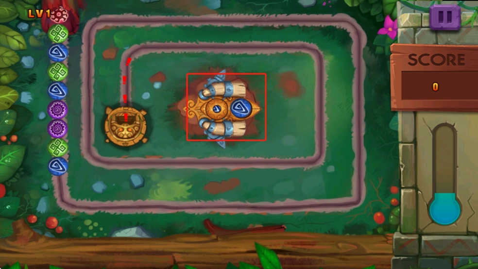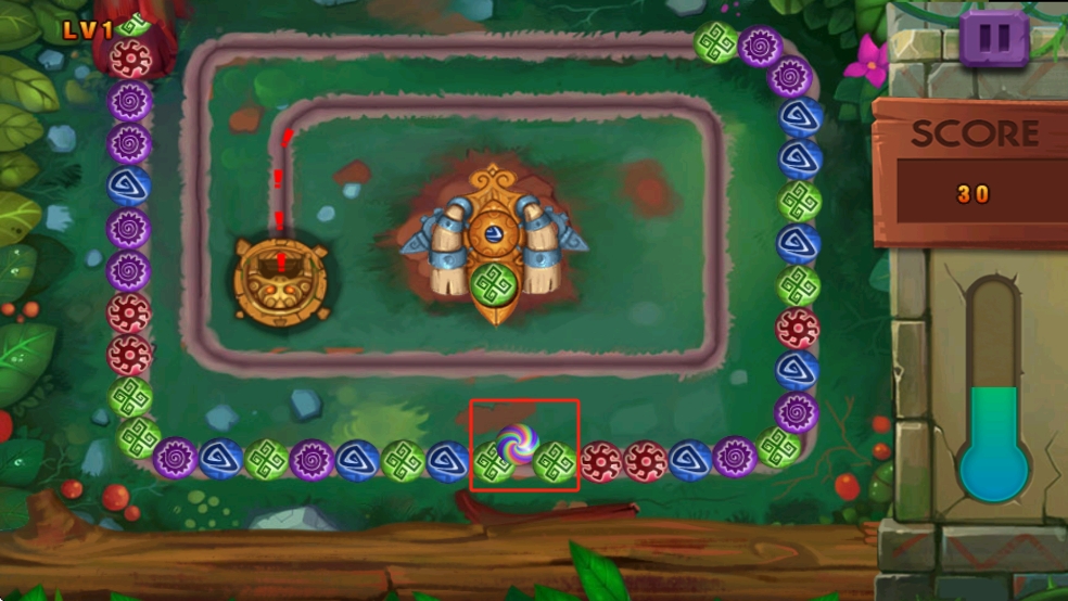 1、觀察軌道上的彩球與中央裝置,瞄準(zhǔn)同色彩球發(fā)射,利用紅框內(nèi)裝置特性,快速消除彩球,阻止其抵達(dá)終點(diǎn)。
