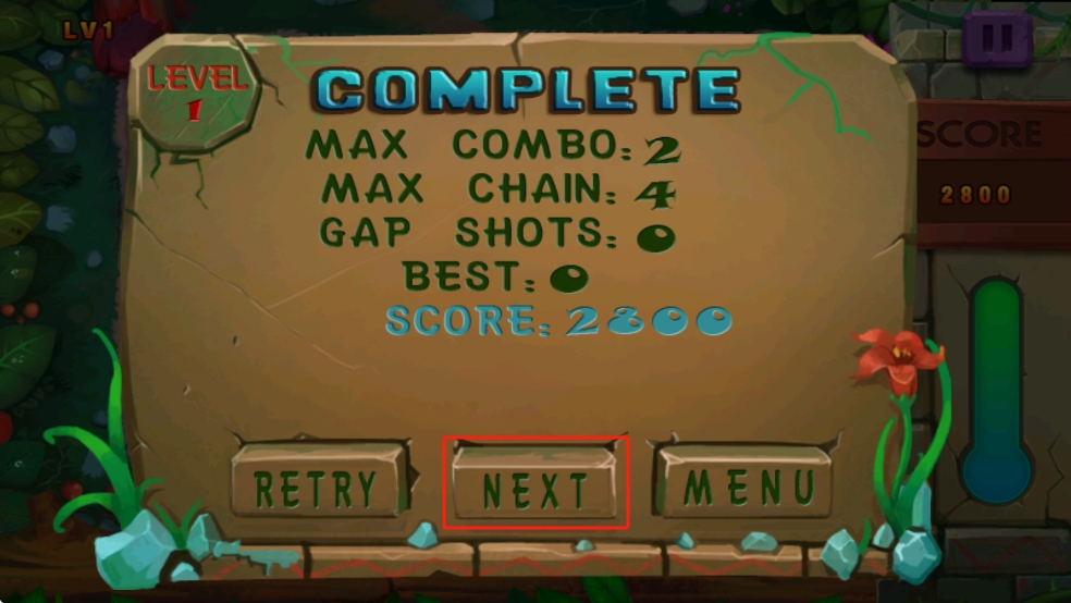 3、成功通關(guān)后界面會顯示本局的數(shù)據(jù),點(diǎn)擊NEXT按鈕即可進(jìn)入下一關(guān),挑戰(zhàn)更復(fù)雜的彩球布局與消除難度。